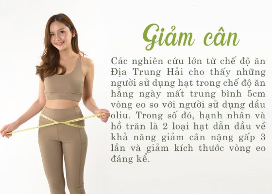 Các nghiên cứu lớn từ chế độ ăn Địa Trung Hải cho thấy những người sử dụng hạt trong chế độ ăn hằng ngày mất trung bình 5cm vòng eo so với người sử dụng dầu oliu. Trong số đó, hạnh nhân và hồ trăn là 2 loại hạt dẫn đầu về khả năng giảm cân nặng gấp 3 lần và giảm kích thước vòng eo đáng kể.